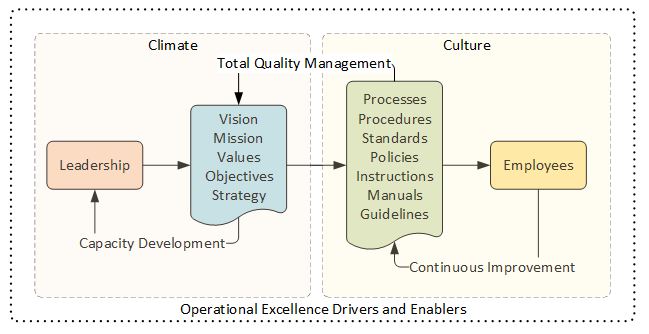 Operational excellence in an organization is a dependent of the alignment of organizational culture and organizational climate and driven by three enablers: continuous improvement, quality management, and capacity development.